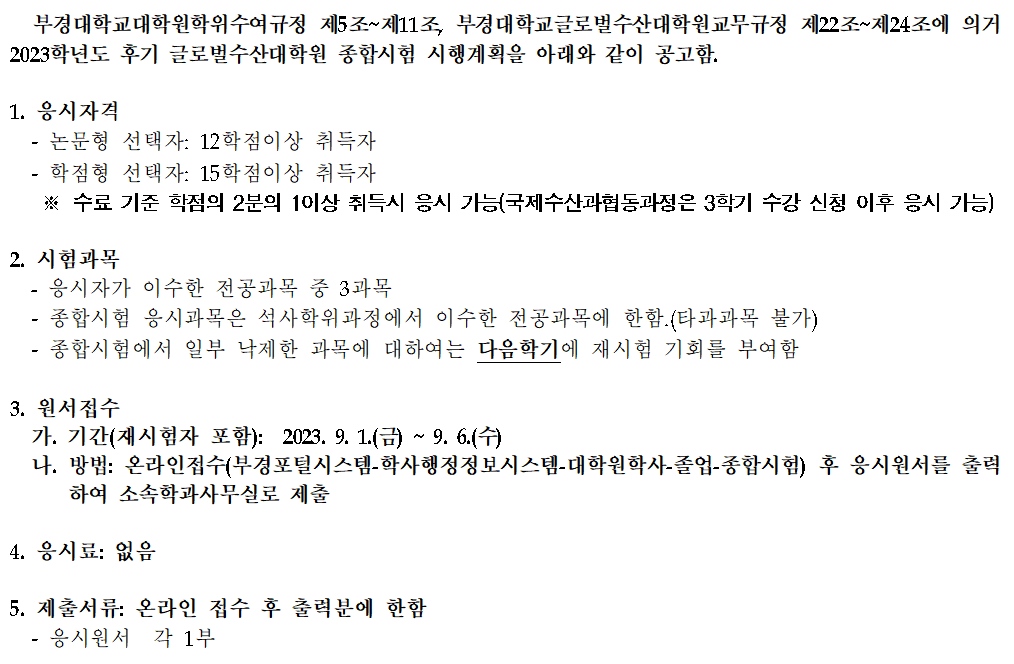 [글로벌수산대학원] 2023학년도 후기 글로벌수산대학원 종합시험 시행계획 안내